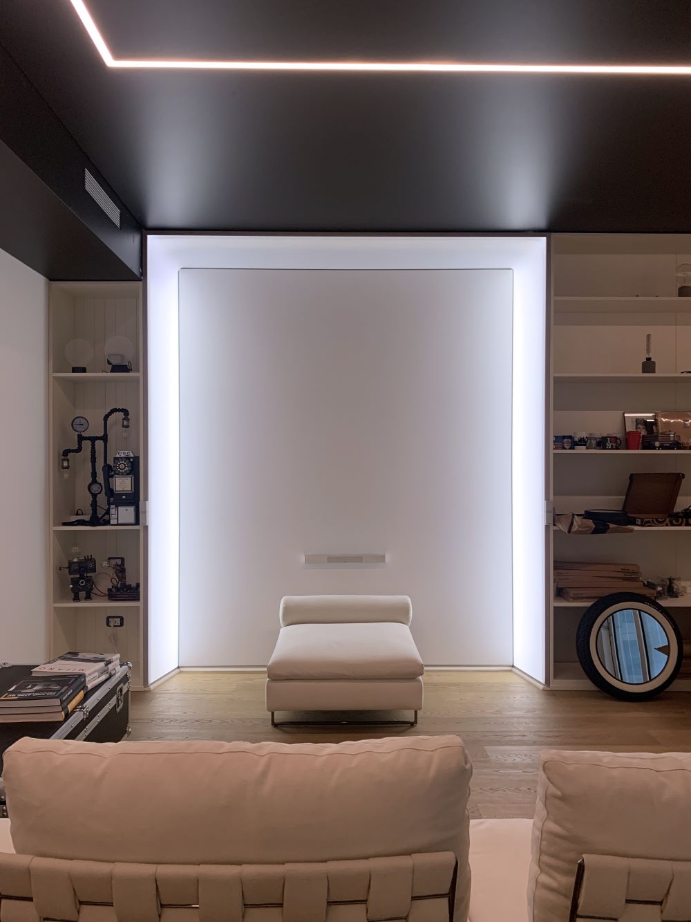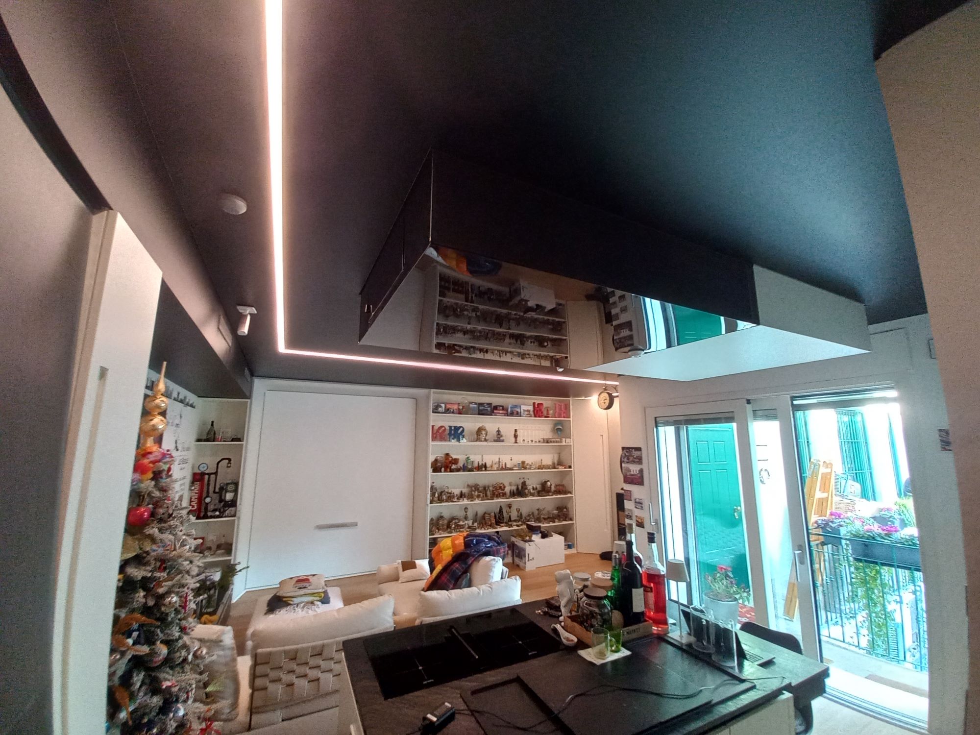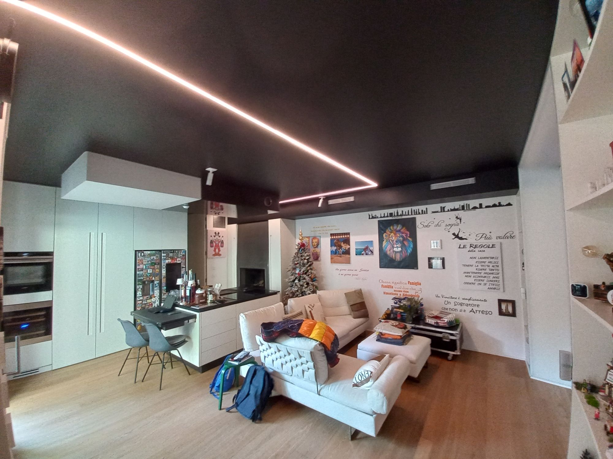 Sopra il mobile cucina si trova una particolare applicazione di soffitto teso con un volume diviso in due zone, una luminosa che inonda di luce diffusa l’ambiente e l’altra in laccato nero nasconde un potente proiettore che visualizza le immagini su schermo a parete in telo teso bianco ottico.