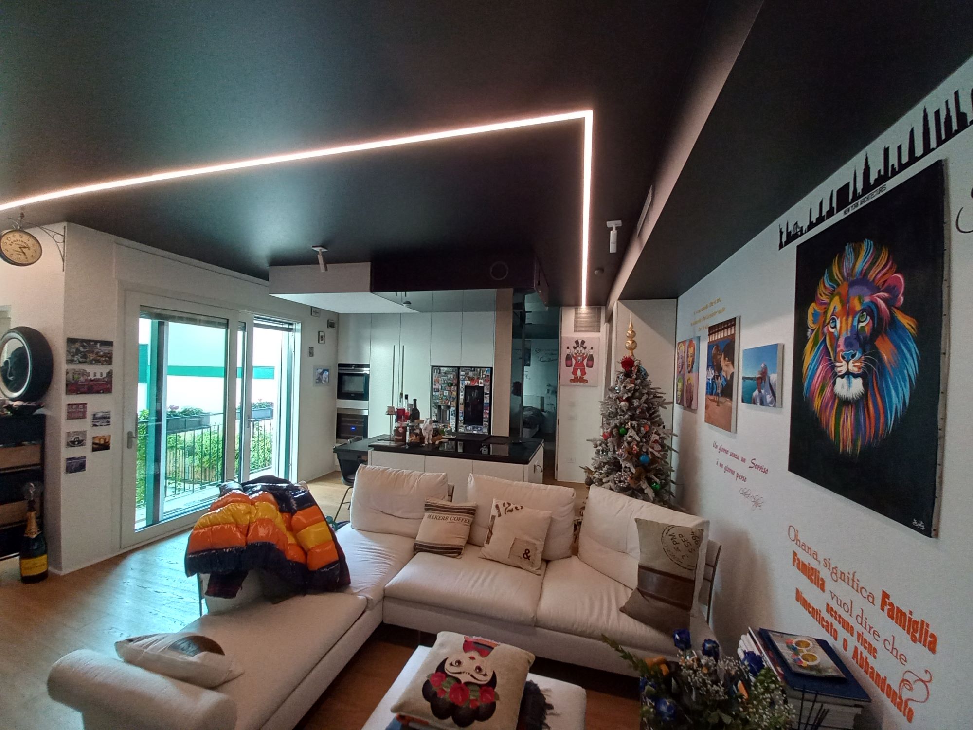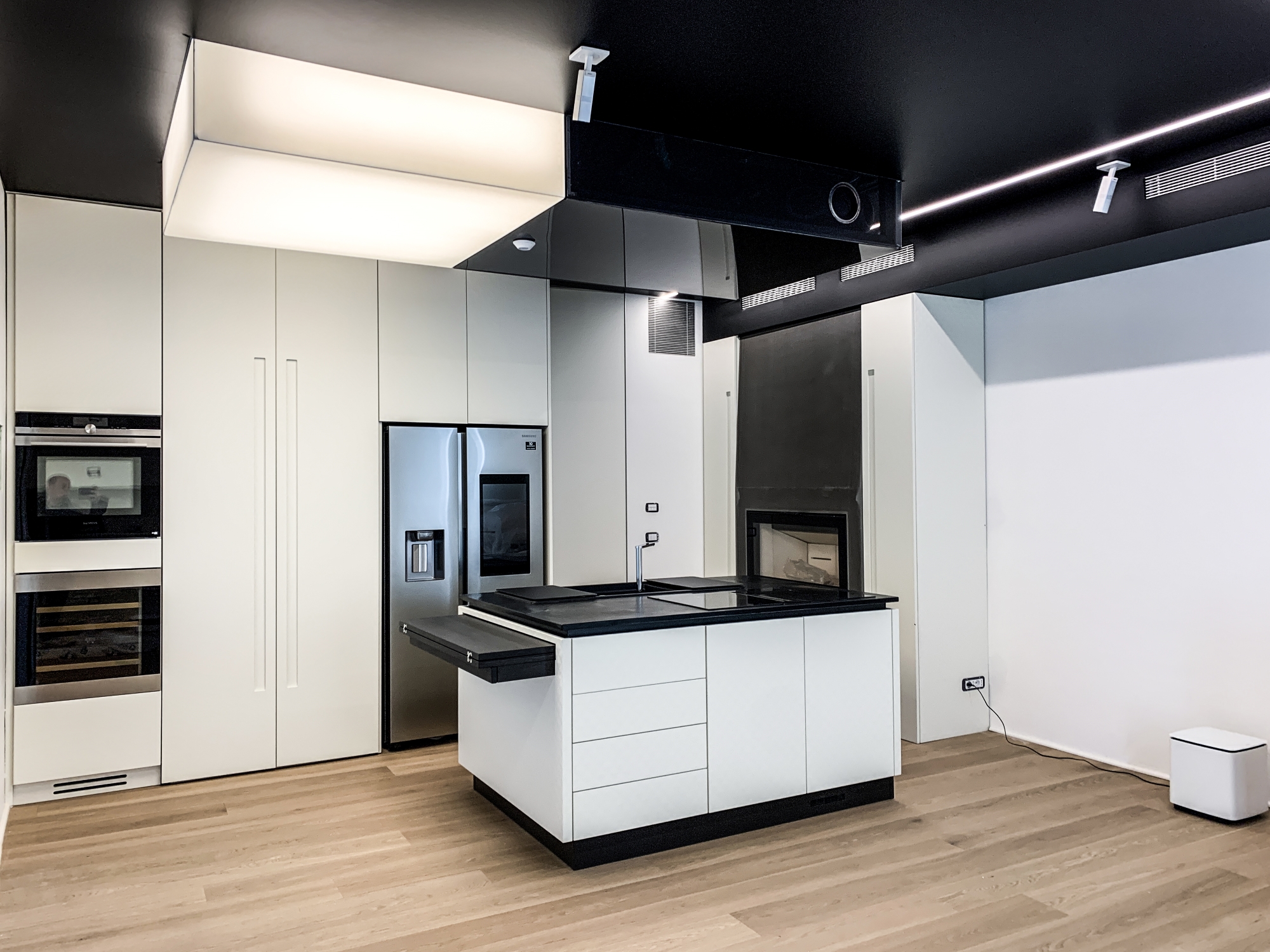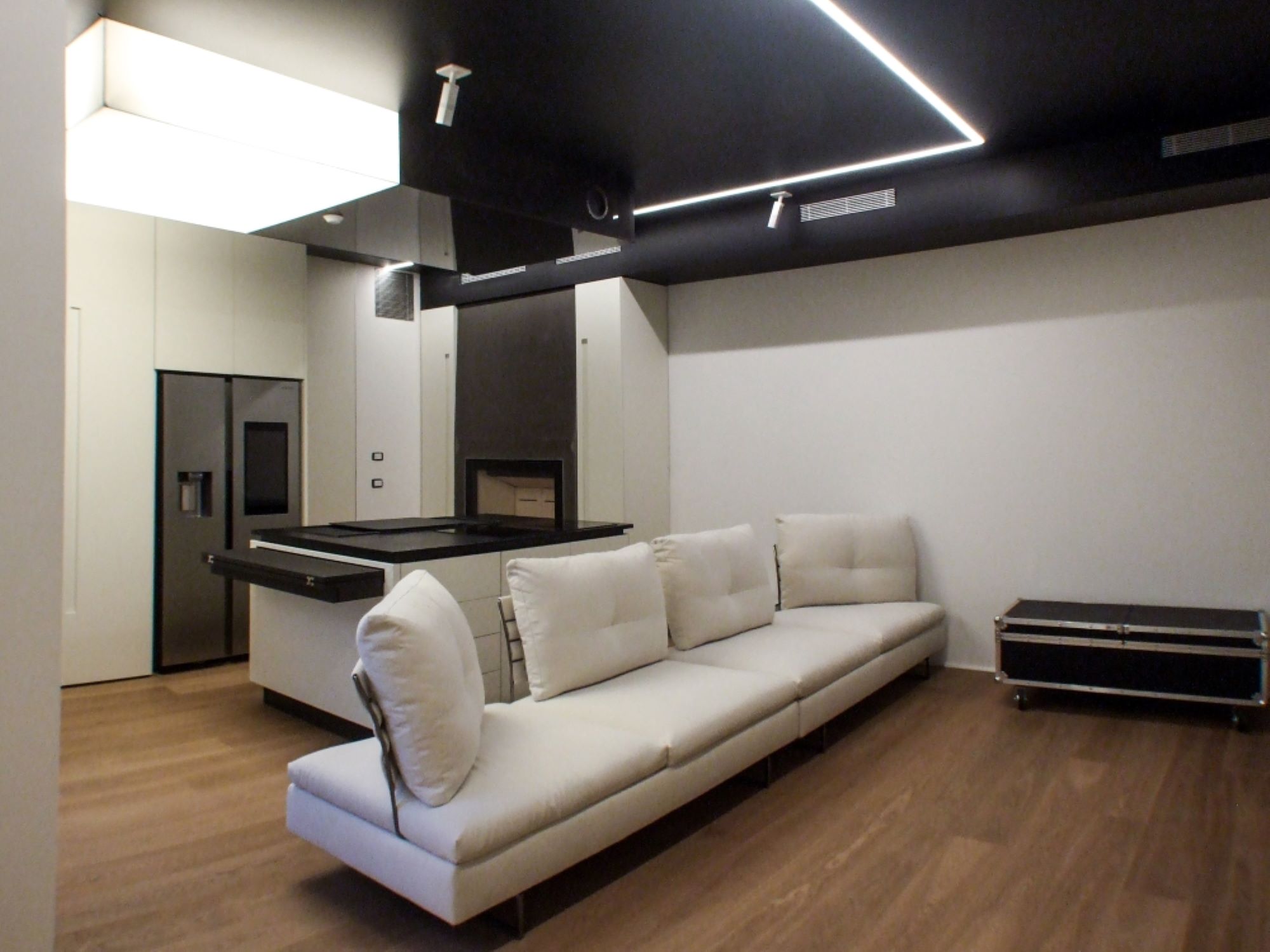 Sopra il mobile cucina si trova una particolare applicazione di soffitto teso con un volume diviso in due zone, una luminosa che inonda di luce diffusa l’ambiente e l’altra in laccato nero nasconde un potente proiettore che visualizza le immagini su schermo a parete in telo teso bianco ottico.