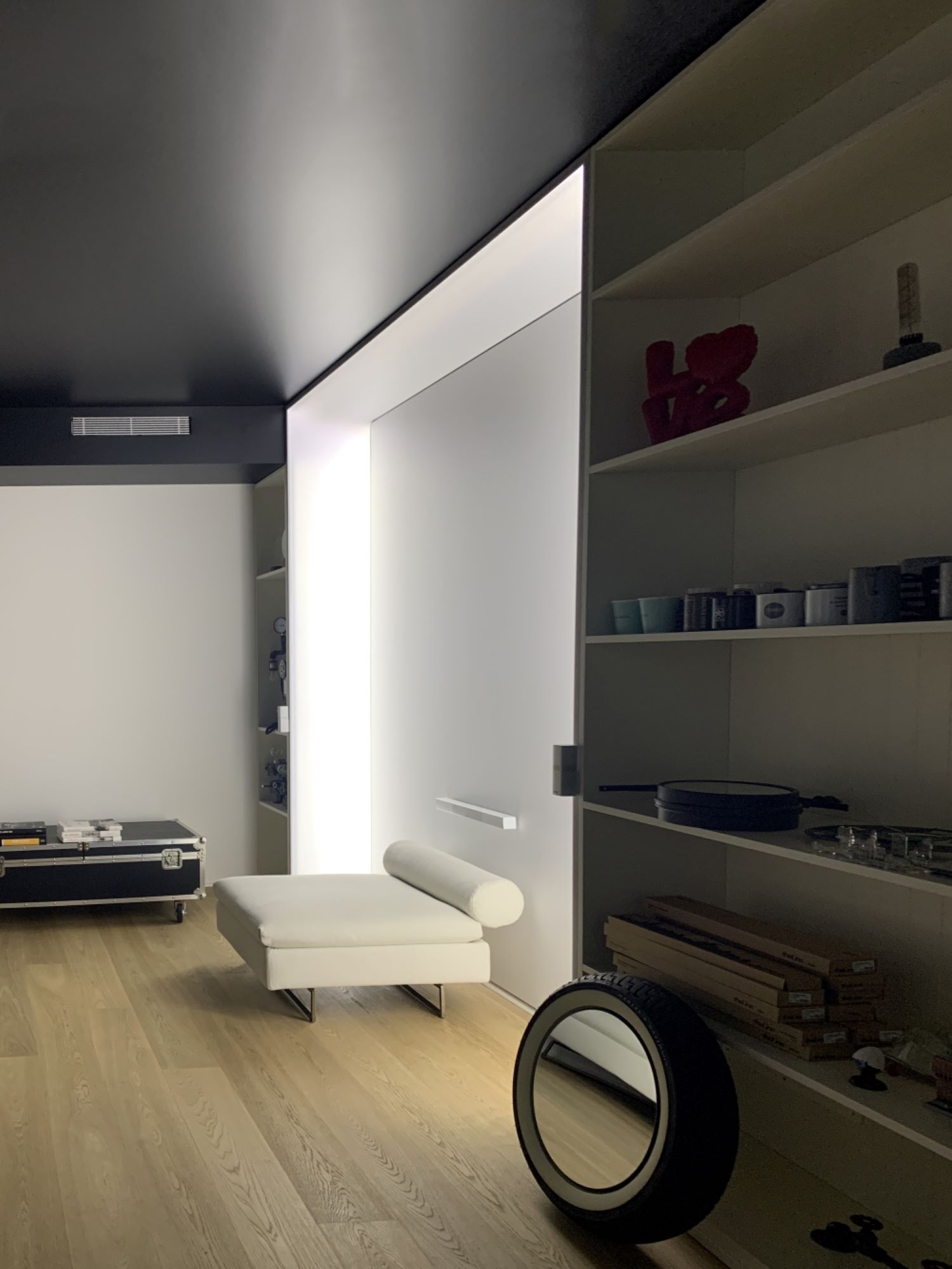 Il soffitto teso fonoassorbente dell’intero appartamento è opaco nero con lunghi tagli di luce led integrati e conferisce all’ambiente una sensazione ovattata e morbida.