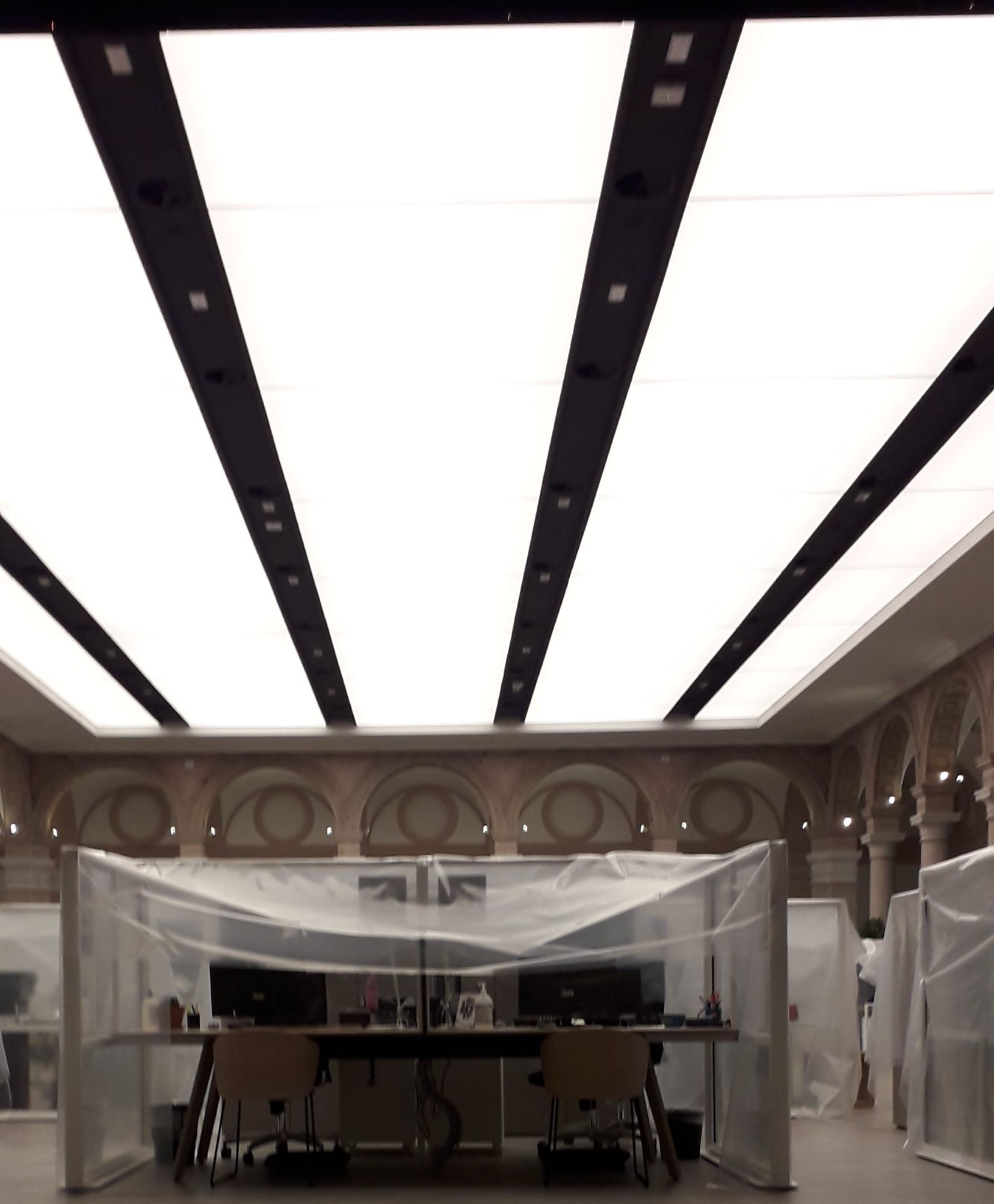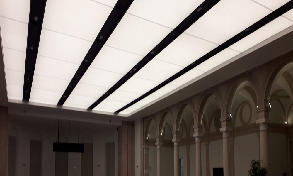 I nodi progettuali hanno trovato soluzione con l’applicazione del soffitto teso “Stylceiling”. La tutela dell’aspetto architettonico del palazzo storico è assicurata dal soffitto teso traslucido che replica fedelmente le vetrate originali. La qualità dell’illuminazione è ottenuta attraverso l’inserimento del nuovo impianto led a luce indiretta e basso consumo gestito con ciclo circadiano. L’acustica ambientale per garantire le migliori condizioni di dialogo e ascolto è raggiunta con le proprietà fonoassorbenti del soffitto teso microperforato. Il soffitto teso “Stylceiling” in meno di un mm di spessore contiene qualità tecniche sorprendenti.